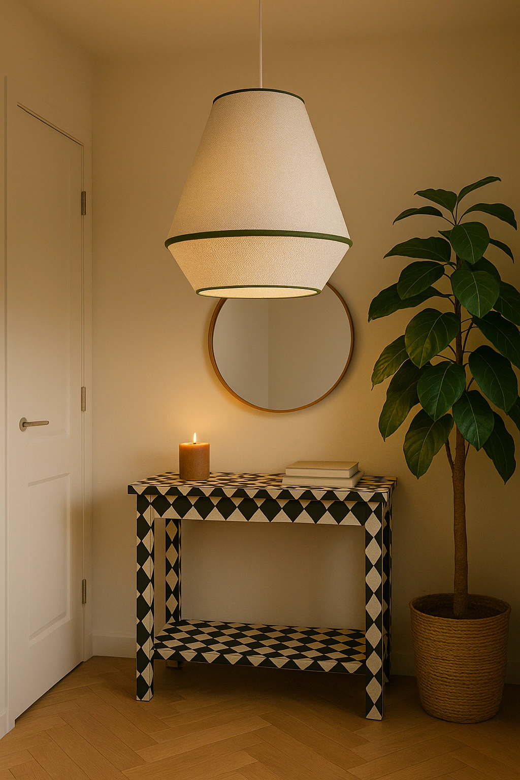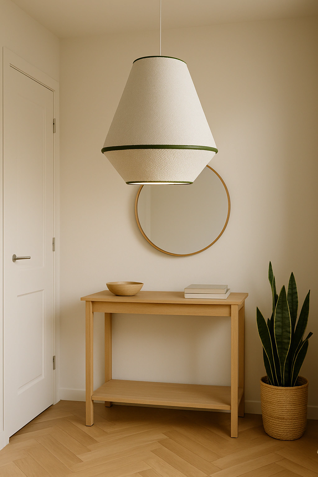 Lámpara Colgante Amapola, hecha en lino y rafia, lo que le proporciona un toque natural y sofisticado. Además, su terminación en terciopelo añade un acabado lujoso que realza su belleza.